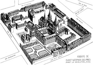• 8ème siècle : Charlemagne dote l’abbaye, devenue Saint-Germain-des-Prés, et impose la règle de Saint Benoit. C‘est un centre intellectuel majeur de la Gaule.
