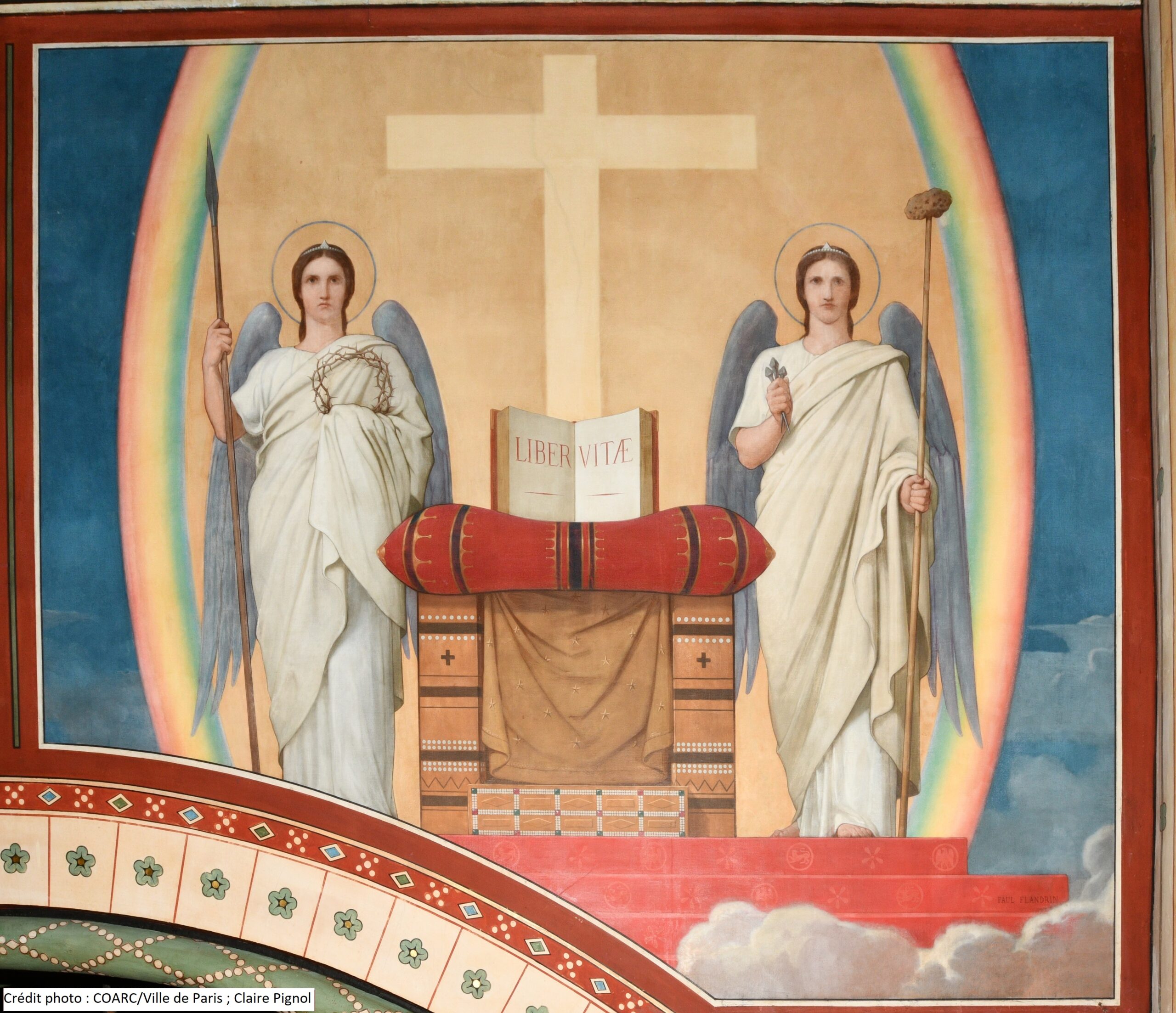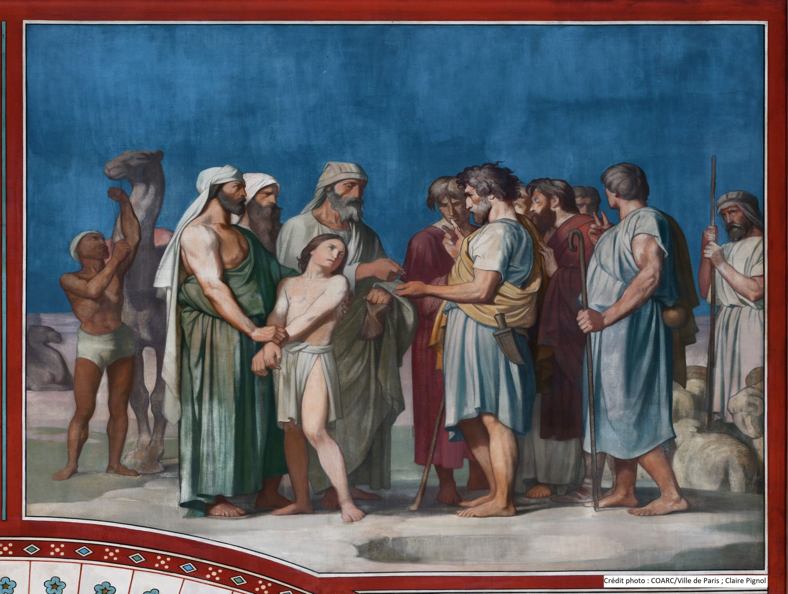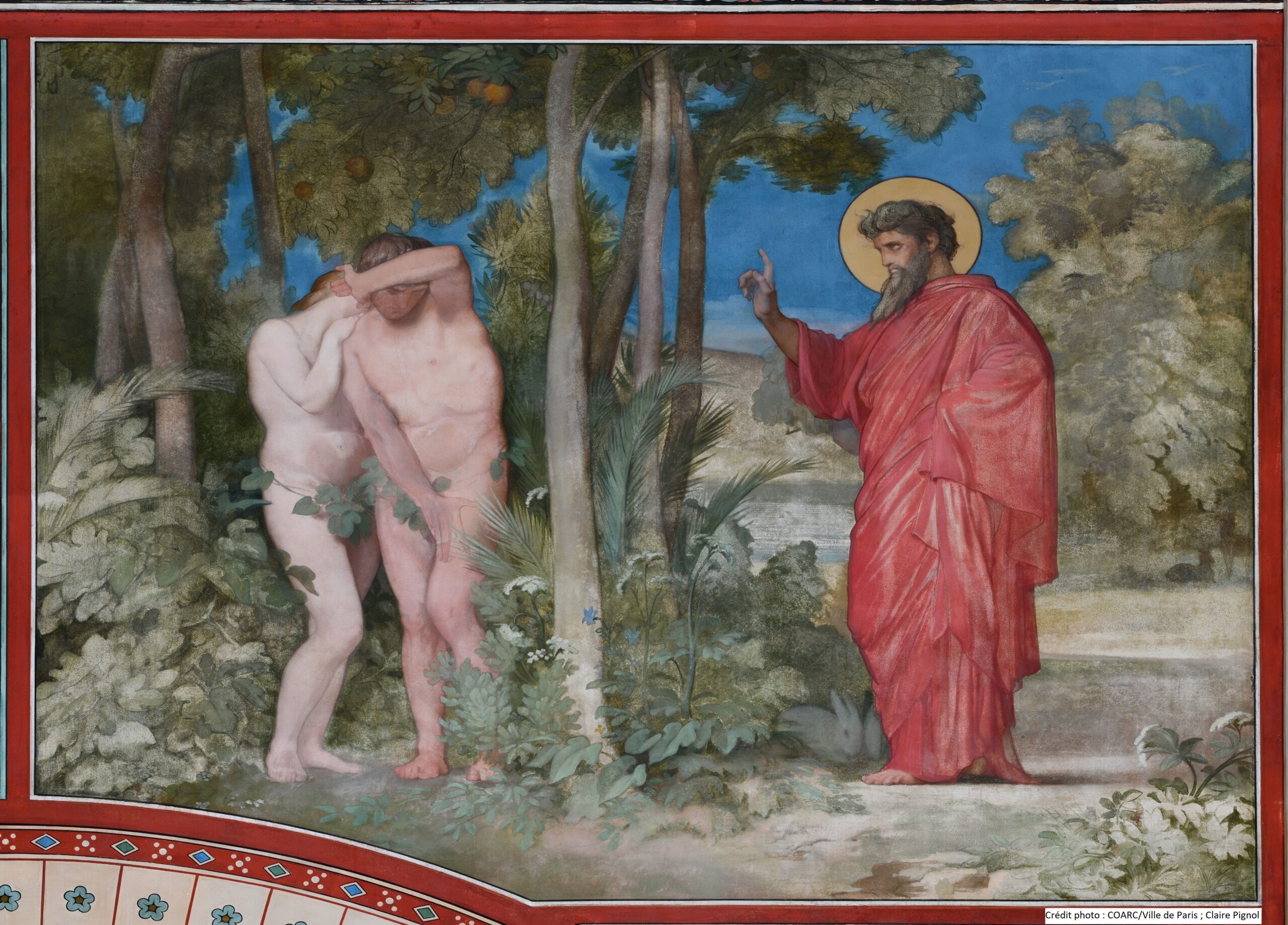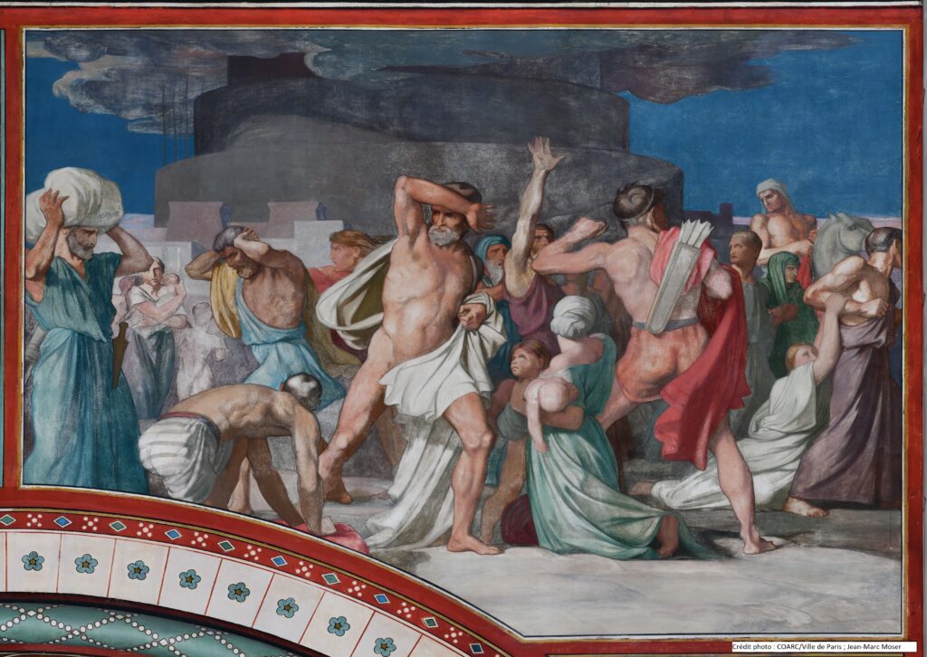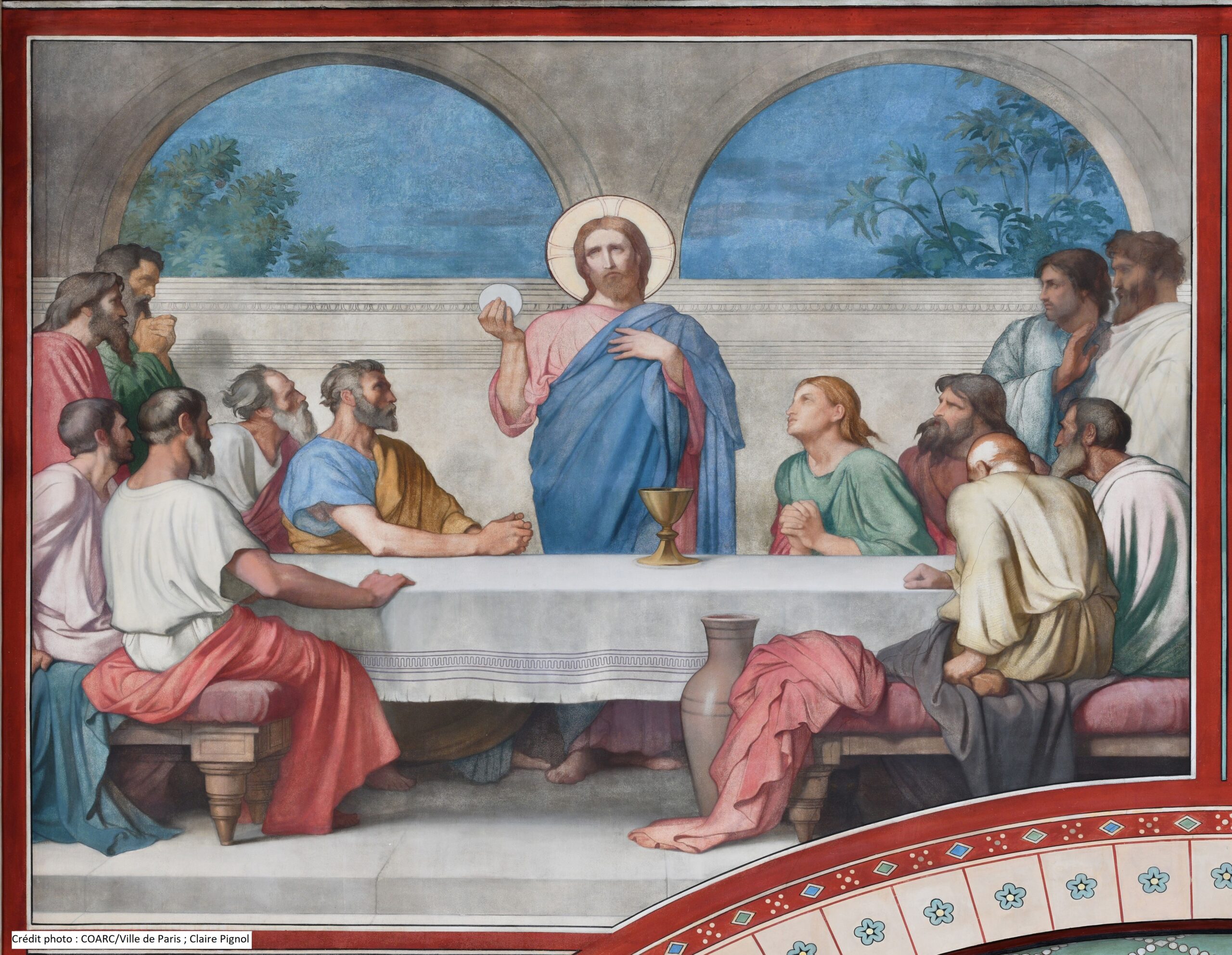 Hippolyte Flandrin a peint 20 fresques pour dĂ©corer la nef de Saint-Germain-des-PrĂ©s. Il a choisi de les organiser en 10 couples de 2 fresques, associant systĂ©matiquement une scène de l’Ancien Testament avec une scène du Nouveau Testament.