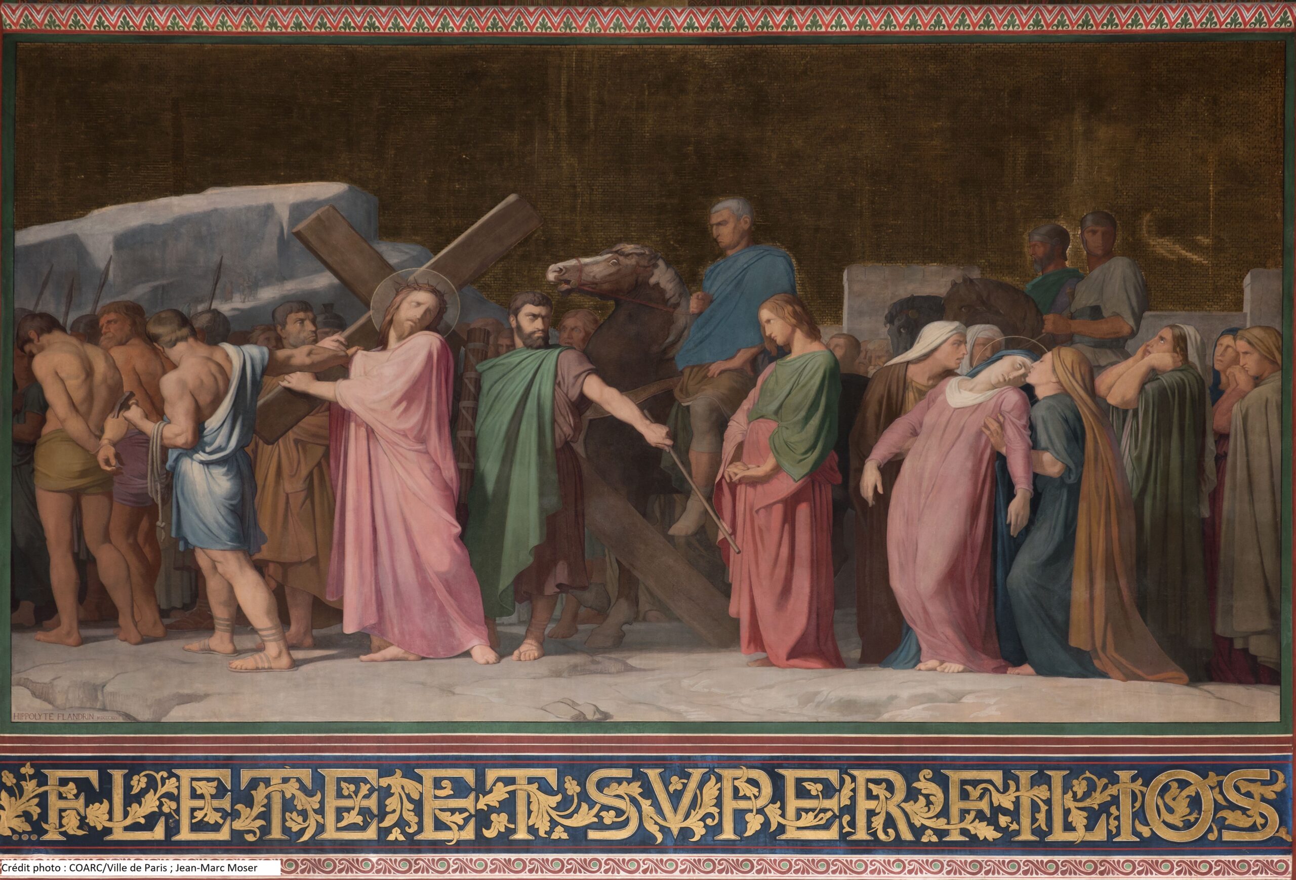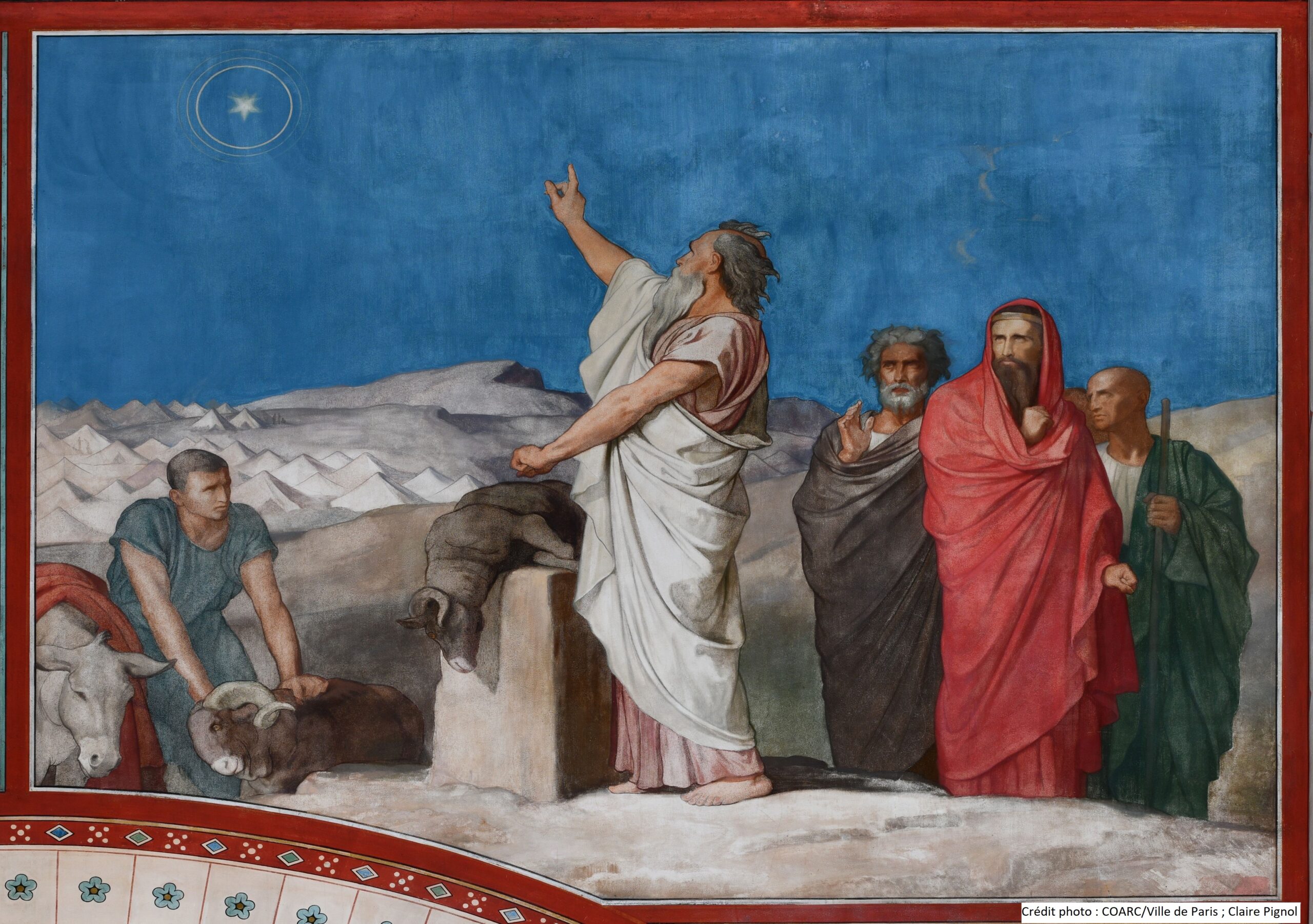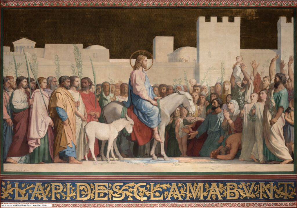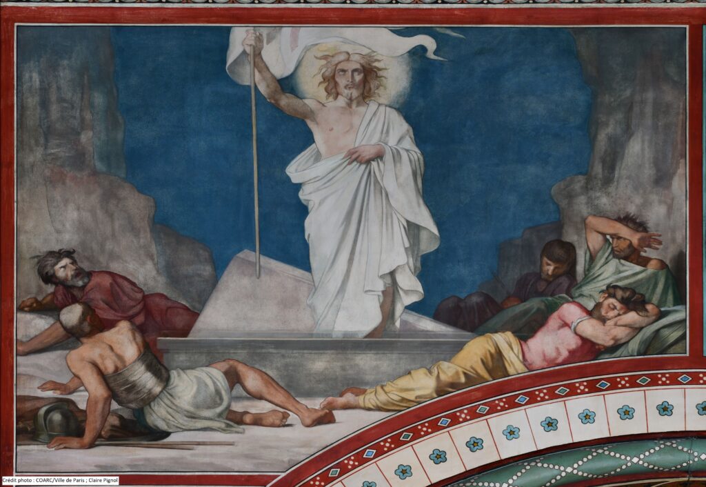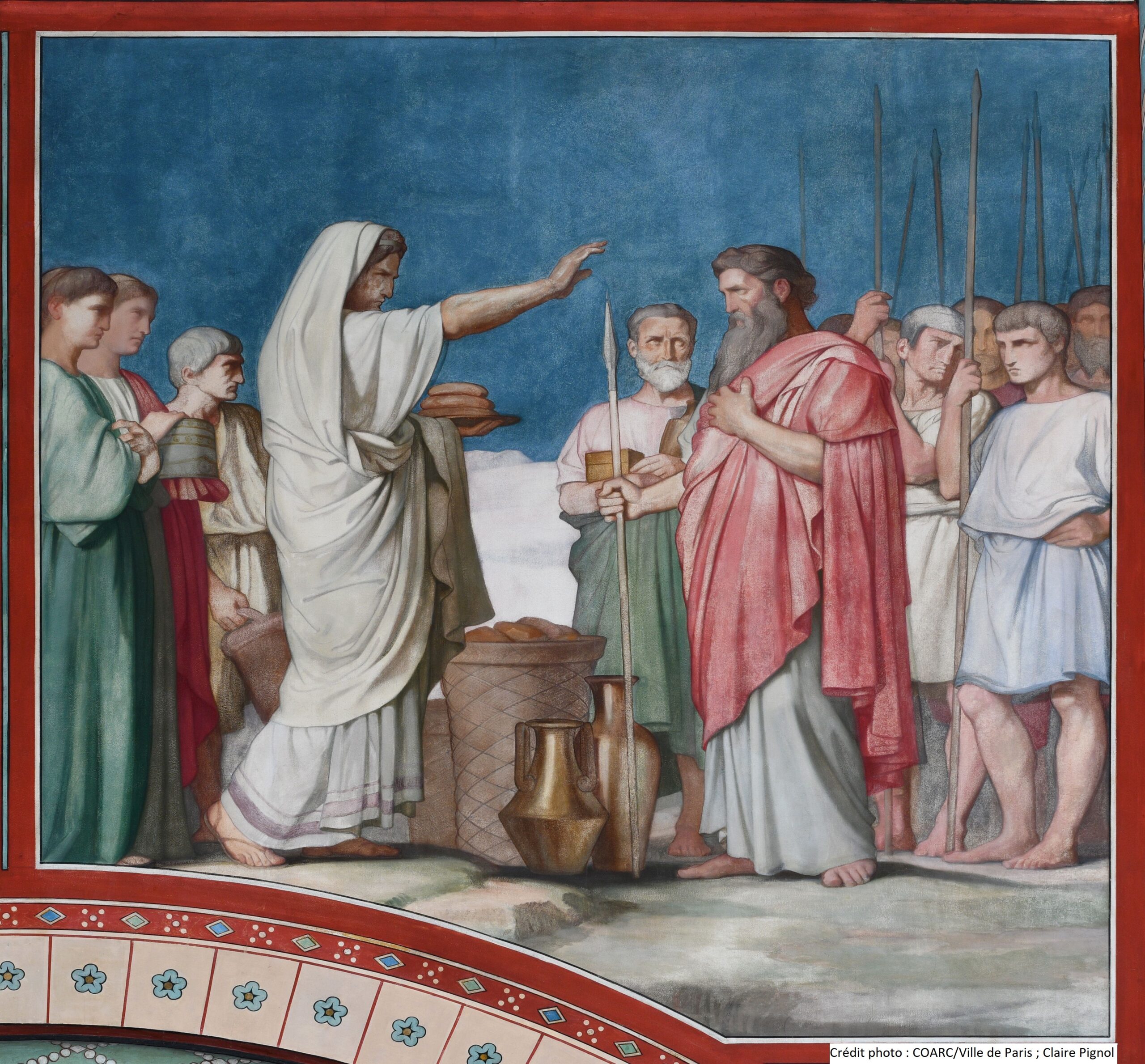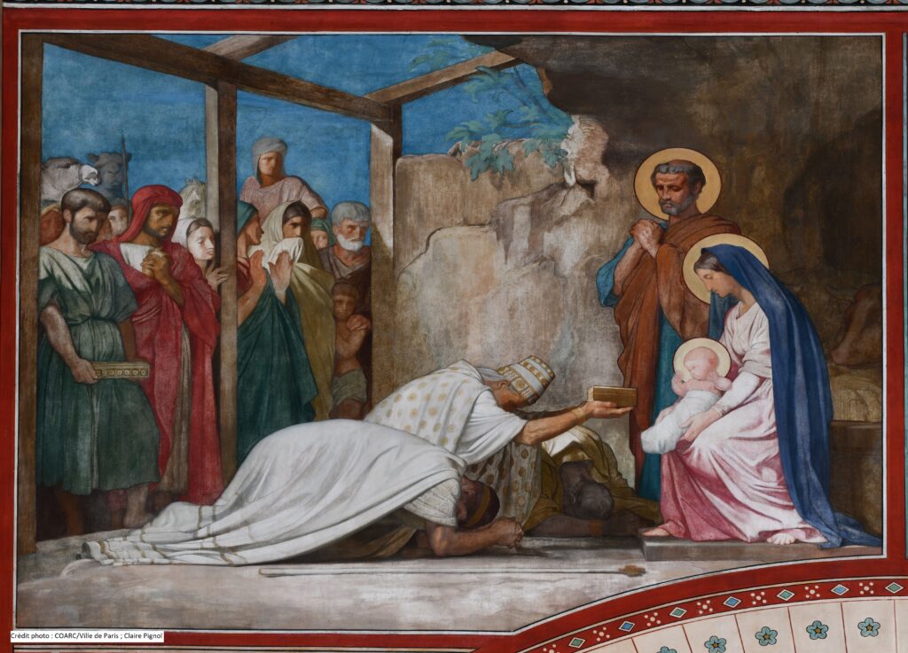 Hippolyte Flandrin a peint 20 fresques pour dĂ©corer la nef de Saint-Germain-des-PrĂ©s. Il a choisi de les organiser en 10 couples de 2 fresques, associant systĂ©matiquement une scène de l’Ancien Testament avec une scène du Nouveau Testament.