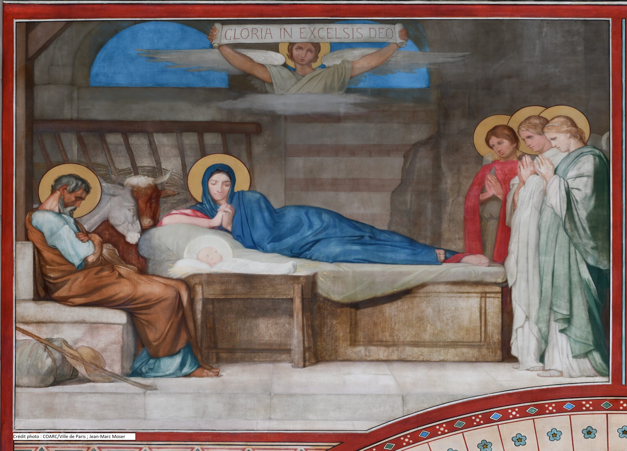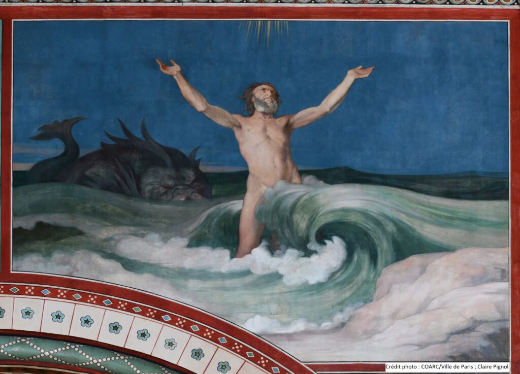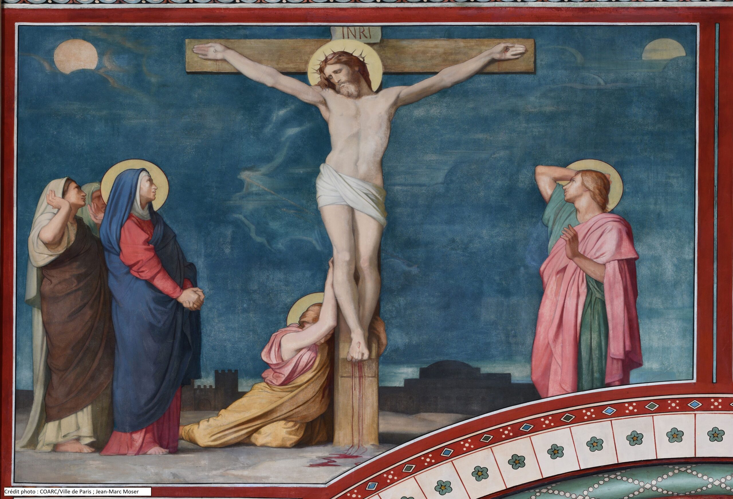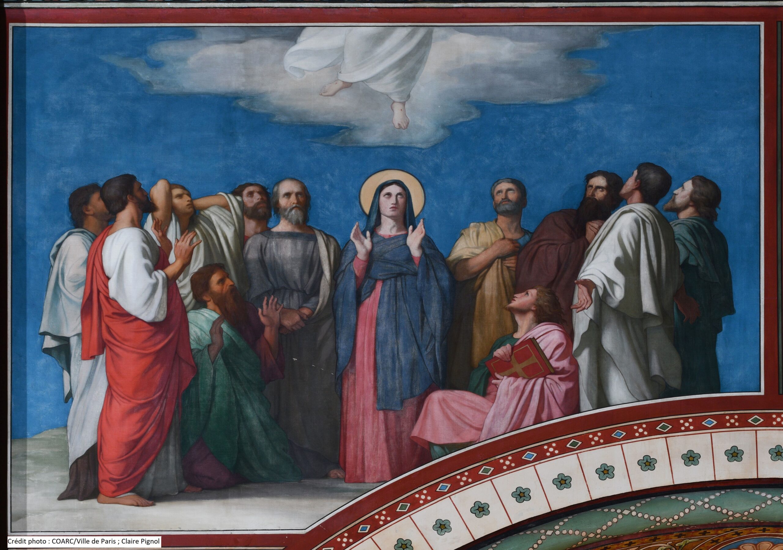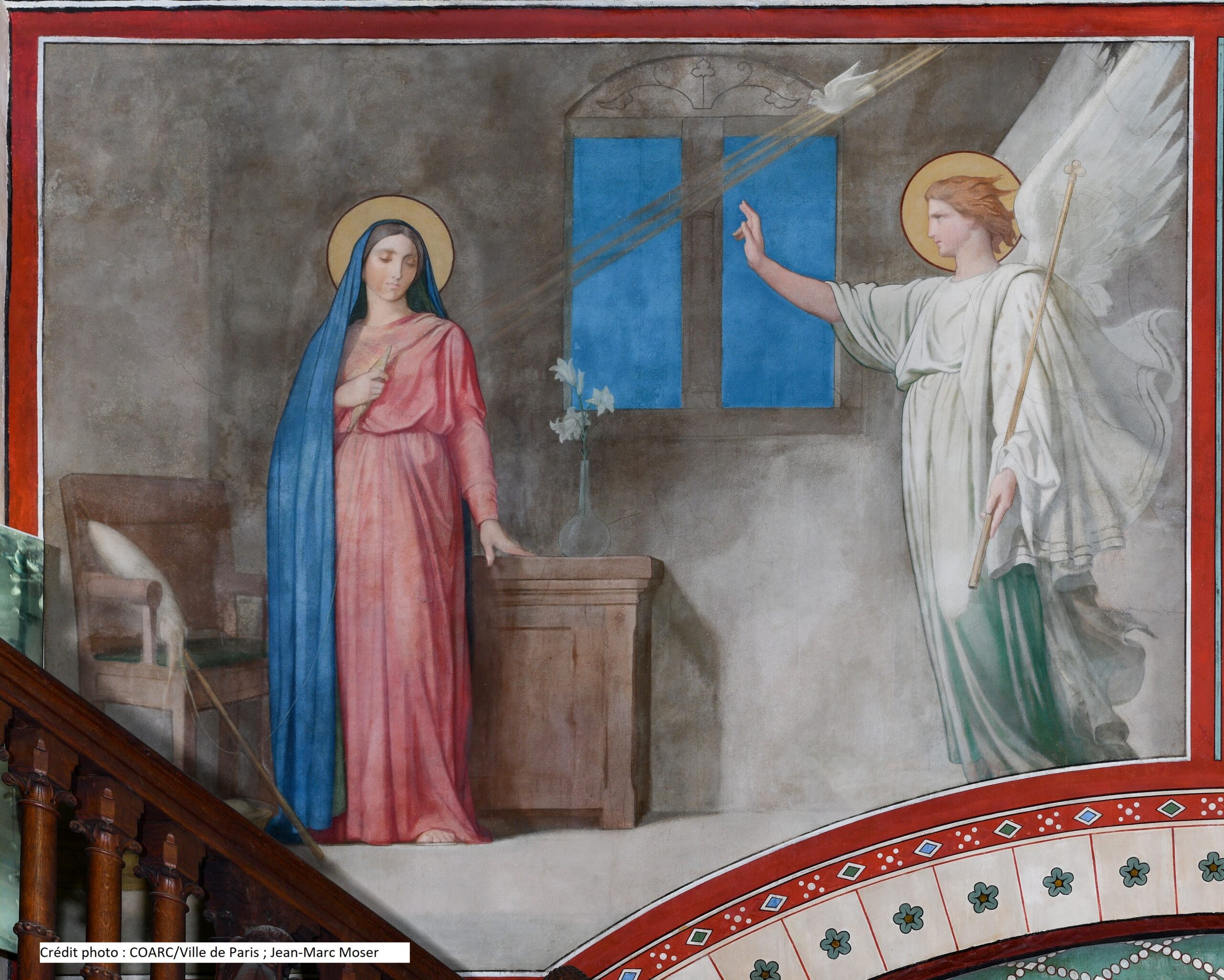Hippolyte Flandrin a peint 20 fresques pour dĂ©corer la nef de Saint-Germain-des-PrĂ©s. Il a choisi de les organiser en 10 couples de 2 fresques, associant systĂ©matiquement une scène de l’Ancien Testament avec une scène du Nouveau Testament.