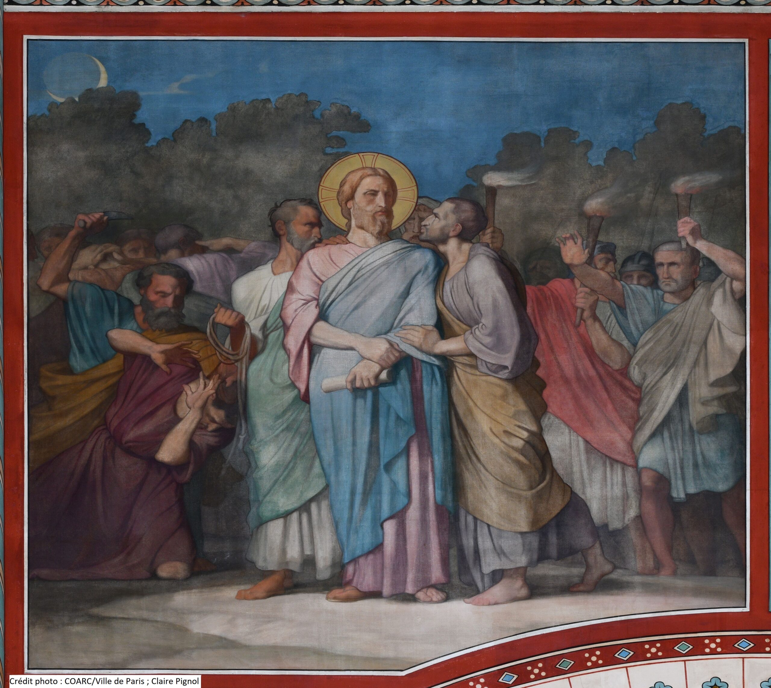 JĂ©sus parlait encore quand Judas, l’un des Douze, arriva et avec lui une foule armĂ©e d’épĂ©es et de bâtons, envoyĂ©e par les grands prĂŞtres, les scribes et les anciens. Or, celui qui le livrait leur avait donnĂ© un signe convenu : “Celui que j’embrasserai, c’est lui : arrĂŞtez-le, et emmenez-le sous bonne garde.” Ă€ peine arrivĂ©, Judas, s’approchant de JĂ©sus, lui dit : “Rabbi !” Et il l’embrassa. Les autres mirent la main sur lui et l’arrĂŞtèrent. (Évangile de Marc, 14, 43-46)